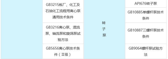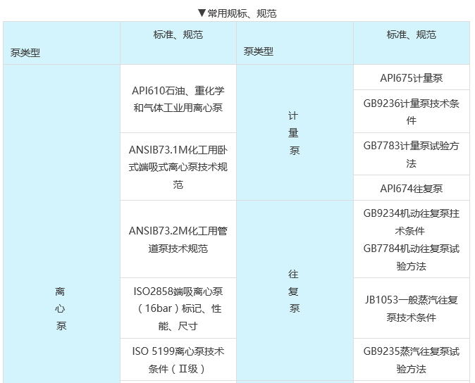 (6)泵的設計、制造、檢驗應符合有關標準、規范的規定,常用的標準和規范見下表 :