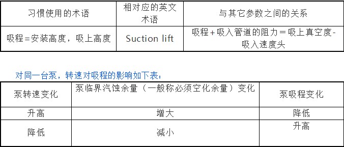工業(yè)泵用戶一般要求泵的吸程(從吸入液面到泵吸入口的中心的垂直高差)高, 但國內(nèi)的泵標(biāo)準(zhǔn)及規(guī)范里,似乎沒有吸程這一術(shù)語。與它相關(guān)的術(shù)語是必須空化余量,約等于10-吸程(m, 沒有考慮吸入阻力)。我們認(rèn)為可以將吸程與國內(nèi)外的相關(guān)術(shù)語及相互之間的關(guān)系作如下對照: