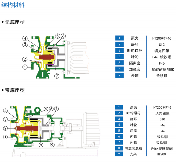 結(jié)構上:WJC-FJ磁力泵全系列均采用主軸不動,轉(zhuǎn)子與葉輪為一體式,全封閉無泄露設計,整泵采用后拉式拆裝結(jié)構,安裝拆卸非常方便。